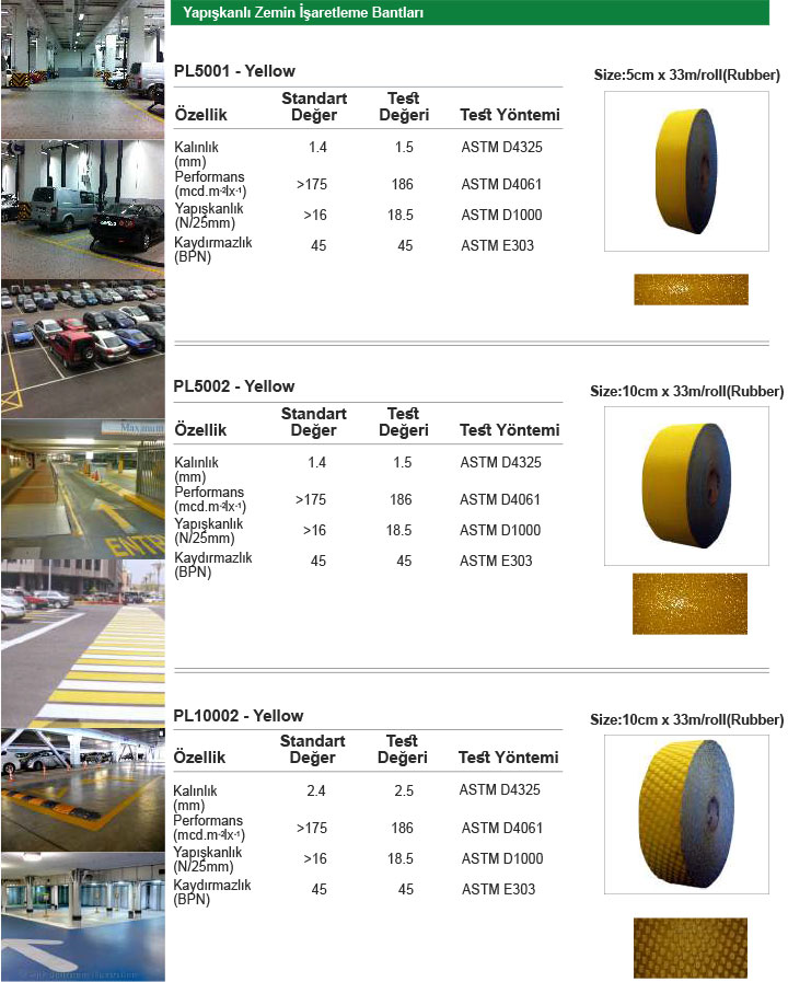 | Dayanıklı yol işaretleri, otoparklar, AVM'ler, hastaneler, fabrikalar, uyarı alanları, yaşam alanları, limanlar, hava alanları,